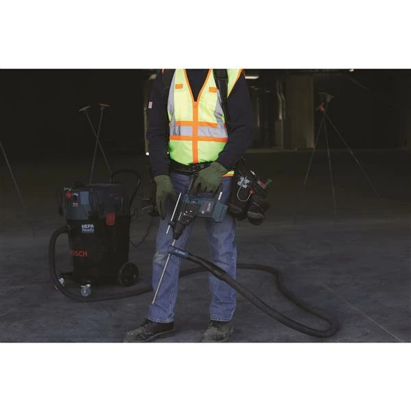 The Bosch 14-gallon dust extractor with auto filter clean and HEPA Fflter provides a complete package that is designed to help users move toward compliance with the OSHA silica dust regulation. It delivers a maximum 150-cubic-feet-of-air-per-minute rate, with a sustainable 97 in. static water lift. The automatic on-board filter-cleaning system activates every 15 seconds to help maintain maximum suction power. The included HEPA filter captures 99.97% of particles at 0.3 microns and larger. The included fleece filter bag helps to protect the filter and provides the optimal containment of dry dust and debris.