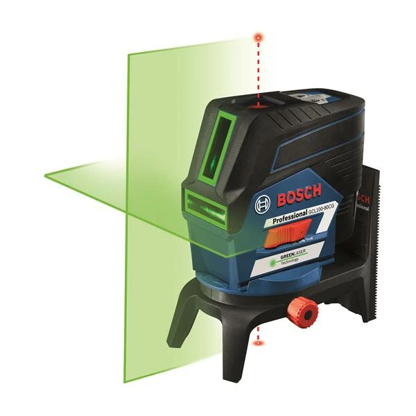 The Bosch GCL100-80CG 12 V Max green-beam connected cross-line laser with plumb points delivers all-in-one versatility, with highly visible lines and points. They provide horizontal level, vertical alignment and plumb point transfer applications. The tool features Bosch-exclusive VisiMax(TM) technology, which monitors tool temperature and power consumption to deliver the brightest line for the job. The laser projects visible green lines up to 100 ft, which are up to 4X brighter than standard red beams. The laser features Bosch 12 V Max Lithium-ion power for extended laser runtime during complex or all day layout jobs, provides a visible range of 100 ft and can work with an optional Bosch laser receiver to extend that range to 165 ft the Smart Pendulum System self-levels up to ±4°, indicates out-of-level condition and locks for safe tool transport.