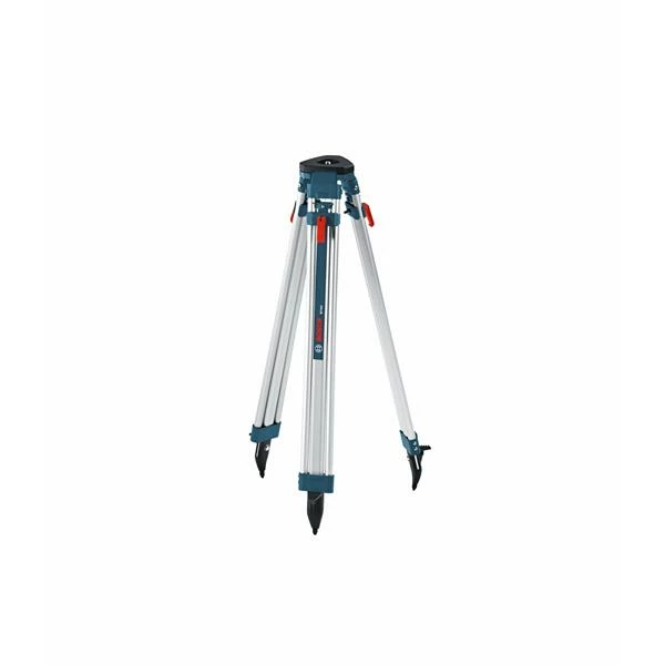 The Bosch contractor tripod is designed for outdoor use with a rotating laser on the job site. It includes a universal flat head, and a hook for plumb bob. It is lightweight for easy transportation.