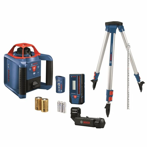 - Features a rotary laser, laser receiver, remote control, tripod, grade rod and hard carrying case