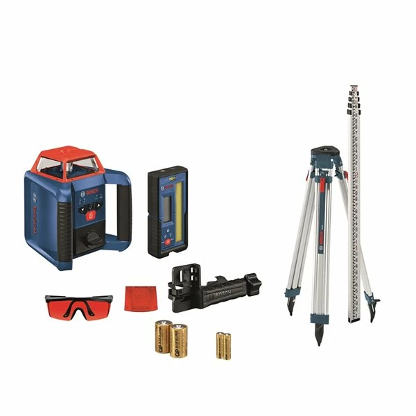 - Features a rotary laser, laser receiver, tripod, grade rod, laser glasses and all-in-one hard carrying case