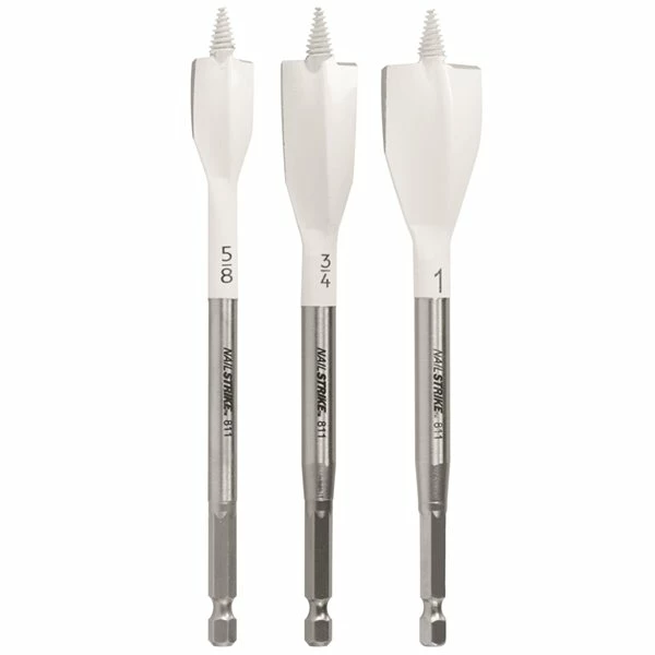 Bosch Nail Strike Wood-Boring Bits are the first wood-boring bits to power through nail-embedded wood. The bit features reamer edges made of tough, reinforced steel that cut through up to 30 nails. Each bit has a fully threaded cone tip that pulls it through the wood, offering best-in-class speed through 2x4s. These bits are ideal for boring clean holes through wood fast to run conduit or pipe. The contoured paddle design also enhances chip removal, contributing to the fast performance. The hex shank with power groove reduces bit slippage in the drill and makes it suitable for use with a variety of drill types, including impact drills. These bits should not be used in a drill press and are not intended for counter boring or doweling.
