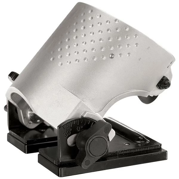 The tilt base for Bosch palm routers features and quick-release clamp to allow both macro and micro fiine depth adjustment. The tilt angle is also easily adjustable. Its construction includes an aluminum housing and and steel base.