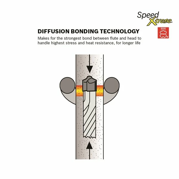 - Long-lasting SDS-max® bit design – manufactured with 100% carbide head and four-cutter design, making it the long-lasting bit for drilling in reinforced concrete and hard aggregate