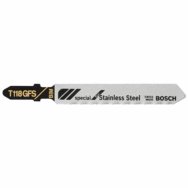 Make a straight cut through metal with this Bosch jigsaw blade. The metal jigsaw blade has a highly-elastic carbon steel body for extra strength. The U shank jigsaw blade has a tooth pitch that measures 0.8 mm. It can cut through a very thin stainless steel sheet.